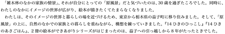わたしは、そのイメージの世界と暮らしの場を近づけるため、東京から栃木県の益子町に移り住みました。そして、「原風景」のうえに、自然のなかでの家族との暮らしを重ねながら、構想を練っていきました。『14ひきのひっこし』『14ひきのあさごはん』、2冊の絵本ができあがりシリーズがはじまったのは、益子への引っ越しから8年がたったときでした。