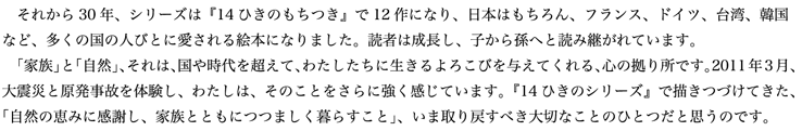 「家族」と「自然」、それは、国や時代を超えて、わたしたちに生きるよろこびを与えてくれる、心の拠り所です。2011年3月、大震災と原発事故を体験し、わたしは、そのことをさらに強く感じています。『14ひきのシリーズ』で描きつづけてきた、「自然の恵みに感謝し、家族とともにつつましく暮らすこと」、いま取り戻すべき大切なことのひとつだと思うのです。