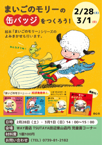 最新作『まいごのモリーはおるすばん』も話題の絵本シリーズ「まいごのモリー」の缶バッジを作ってみませんか?読みきかせもあります♪ ぜひ、ご家族みなさまでお越しください。■日 時:2026年2月28日(土 ...