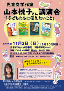 11月2日(日曜日)、久留米市立中央図書館にて、『先生、しゅくだいわすれました』『神隠しの教室』など、子どもたちのリアルな姿とユーモアあふれる物語で多くの読者に親しまれている、作家の山本悦子さんの講演 ...