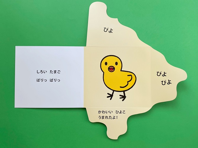 たまごから、かわいいあかちゃんうまれるよ! 三方にひらくページをゆっくりとひらいていくと……。ひよこ、カタツムリ、うみがめ、ペンギン……つぎつぎとあかちゃんたちがうまれます。