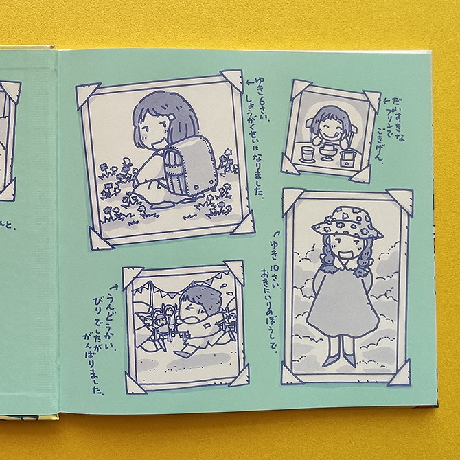 前見返し(表紙を開いて最初に目に入る、表紙と本の中身をつなぎあわせているページ)には、「ゆきちゃん」が子どもだった頃の思い出の写真が、後ろ見返しには、「ぼく」と、その成長を見守るおばあちゃんとの思い出の写真が並び、物語には出てこない2人がすごしてきた豊かな時間が描かれています。