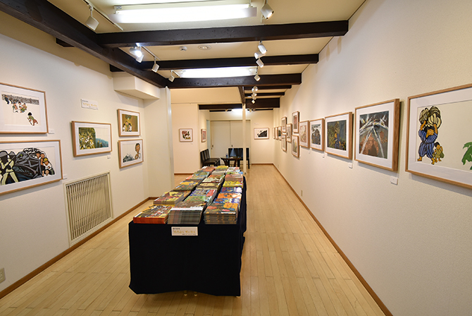 会場では『なきむしせいとく 沖縄戦にまきこまれた少年の物語』の原画全点の他、型絵染の作品が多数展示されています。