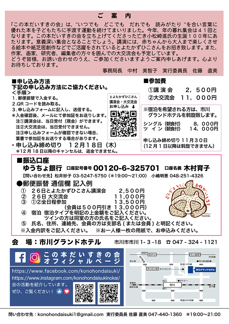 ■お問い合わせ:konohondaisuki1@gmail.com 実行委員長 佐藤直美047-440-1360