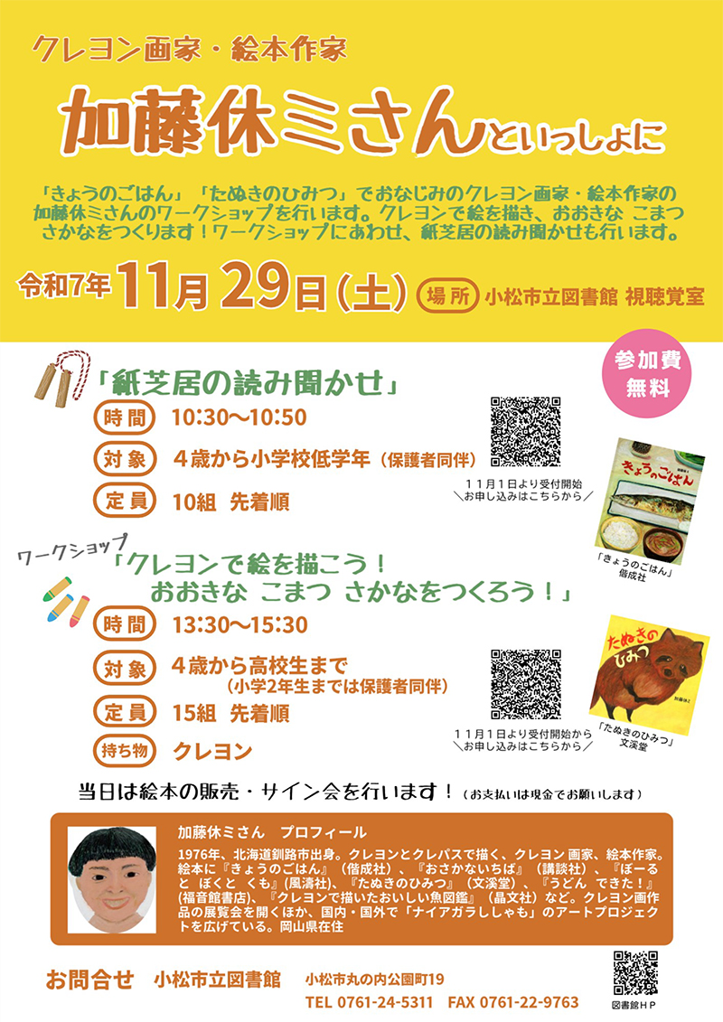 <石川県小松市>「クレヨン画家・絵本作家 加藤休ミさんといっしょに 紙芝居の読み聞かせ&ワークショップ」が開催されます!