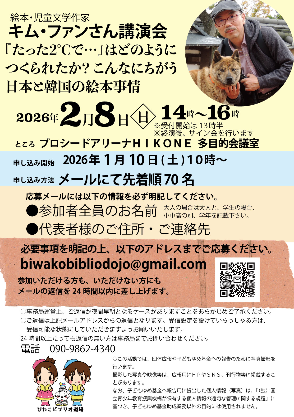 2026年2月8日(日)、滋賀県彦根市のプロシードアリーナHIKONEにて、昨年度青少年読書感想文全国コンクールの課題図書『たった2℃で…』の著者・キム・ファンさんの講演会が開催されます。入場無料です。