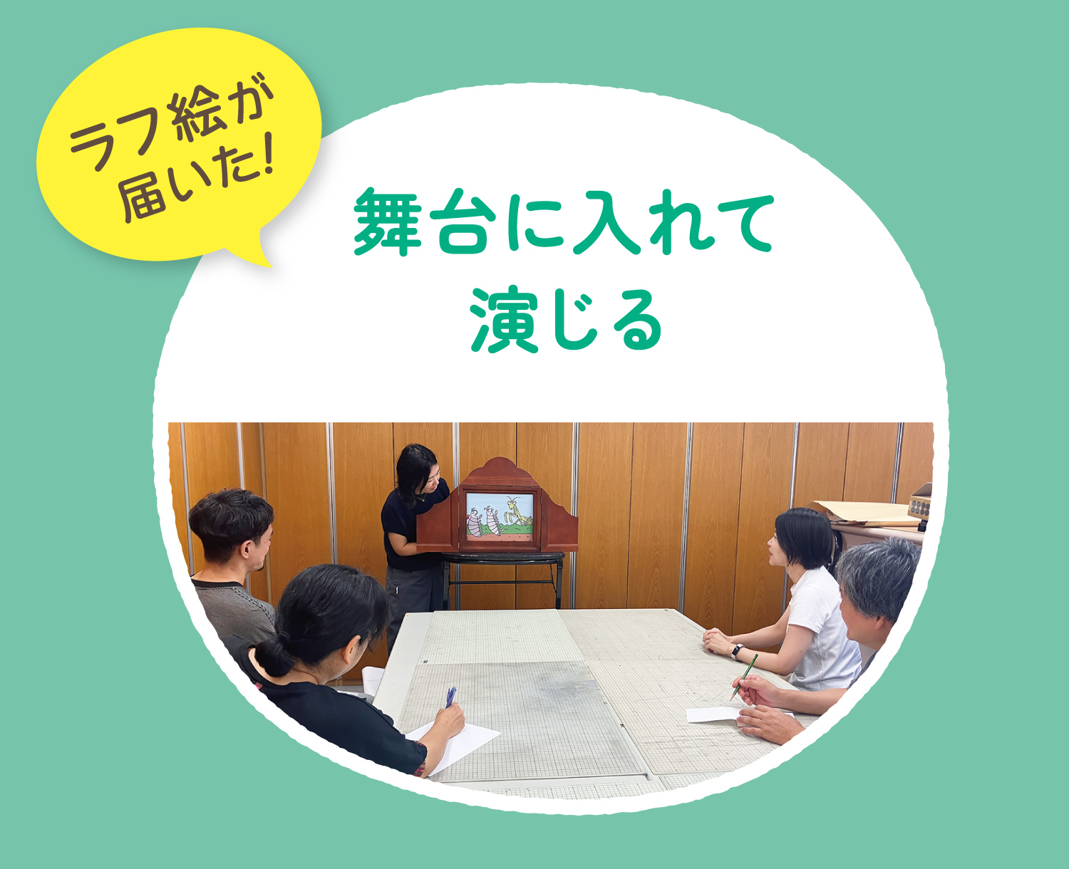 ラフ、いわゆる下絵が届いたら、紙しばいの形にして、舞台に入れて実際に演じてみます。