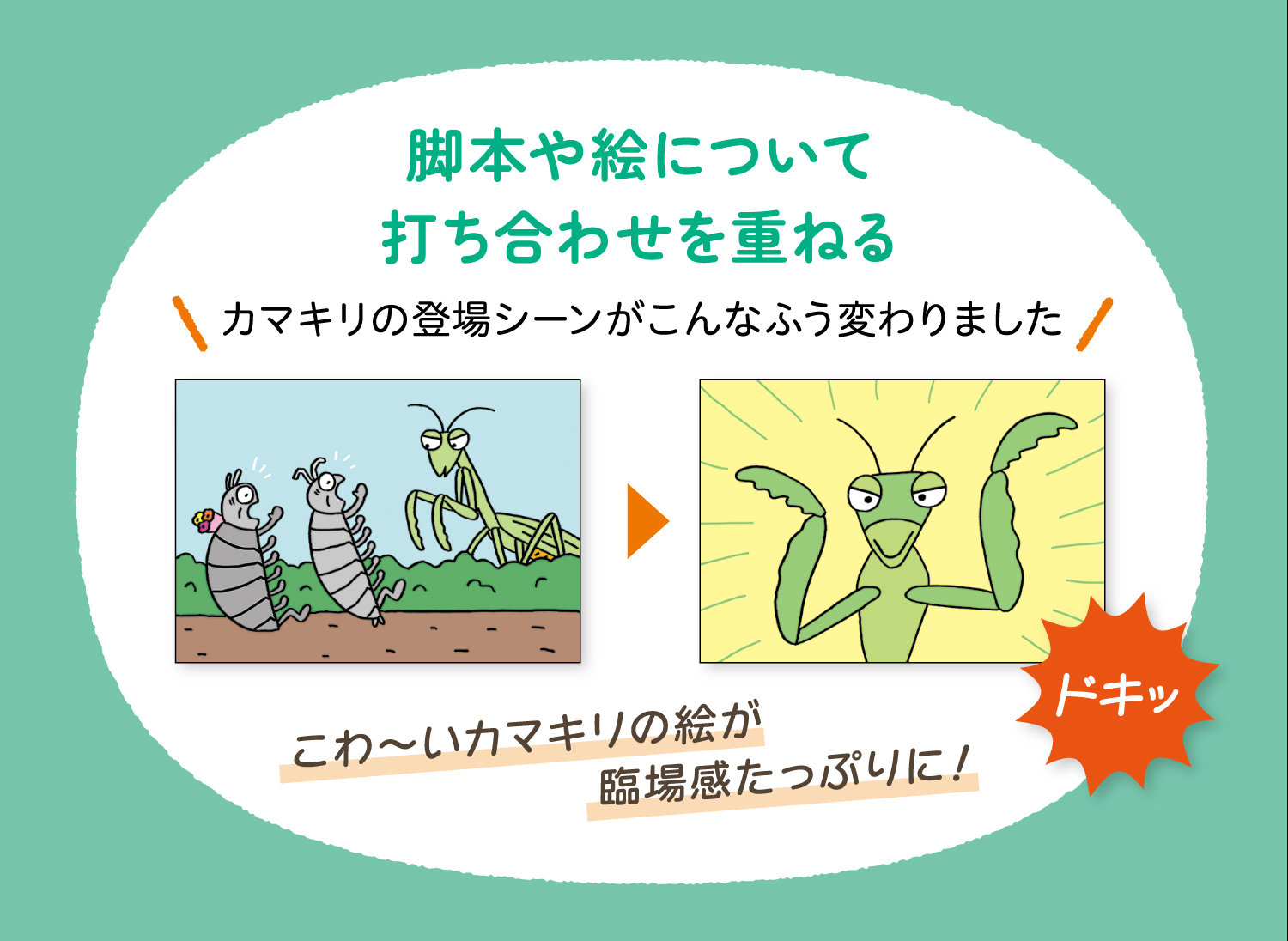 今回は、「ともだちだいすき」コース4月号『むし どっちがどっち?』を例に、紙芝居がどんなふうにつくられているのかをご紹介します。