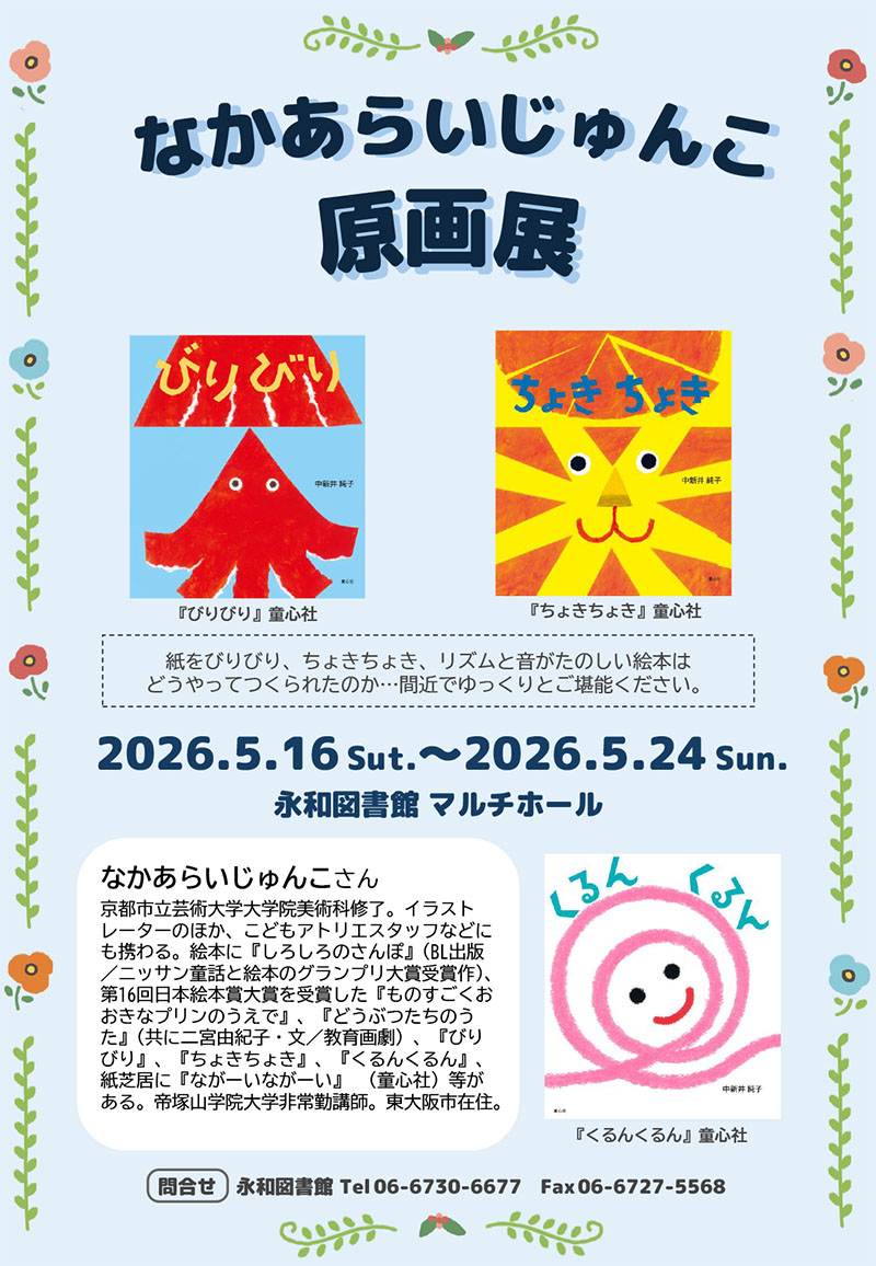 永和図書館マルチホールにて、中新井純子さんの絵本『びりびり』『ちょきちょき』などの原画展が行われます。