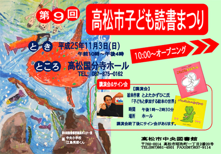 「第9回高松市子ども読書まつり」の中で、とよたかずひこ先生の講演会が行われます。その他、子どもたちとボランティアによる「おはなし会」、手づくりおもちゃ・段ボール遊びなど、楽しいイベントが満載です。ぜひ足をお運びください。