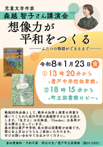 2026年1月23日(金)に児童文学作家 森越 智子さんの講演会が行われます。お近くの方はぜひご参加ください。◆想像力が平和をつくるーふたつの物語ができるまでー ■日 時:2026年1月23日(金) ...