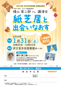 1月31日(土)に佐賀県伊万里市の伊万里市民図書館ホールにて紙芝居講座が開催されます。弊社 取締役編集長の橋口が講師を務めます。意外と知らない紙芝居のあれこれを、作り手の立場からご紹介します。紙芝居の ...