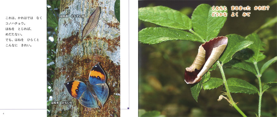 葉っぱそっくりのチョウ、かわらの石そっくりのたまごをうむイカルチドリ、サンゴそっくりのタツノオトシゴ、まわりの色にまぎれるタテゴトアザラシの赤ちゃん……