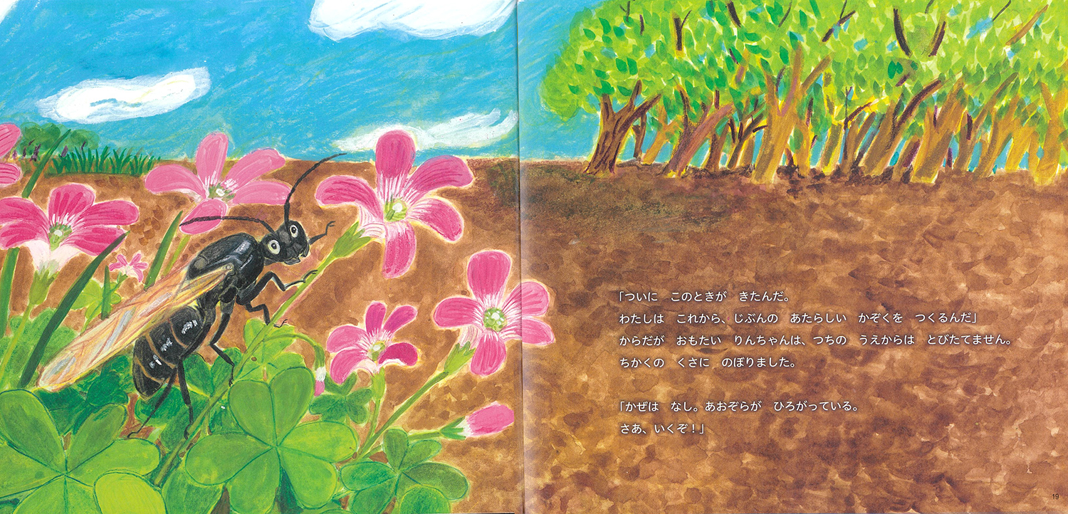 太陽がさんさんとふりそそぐ夏、土の中のへやで、りんちゃんはうまれました。