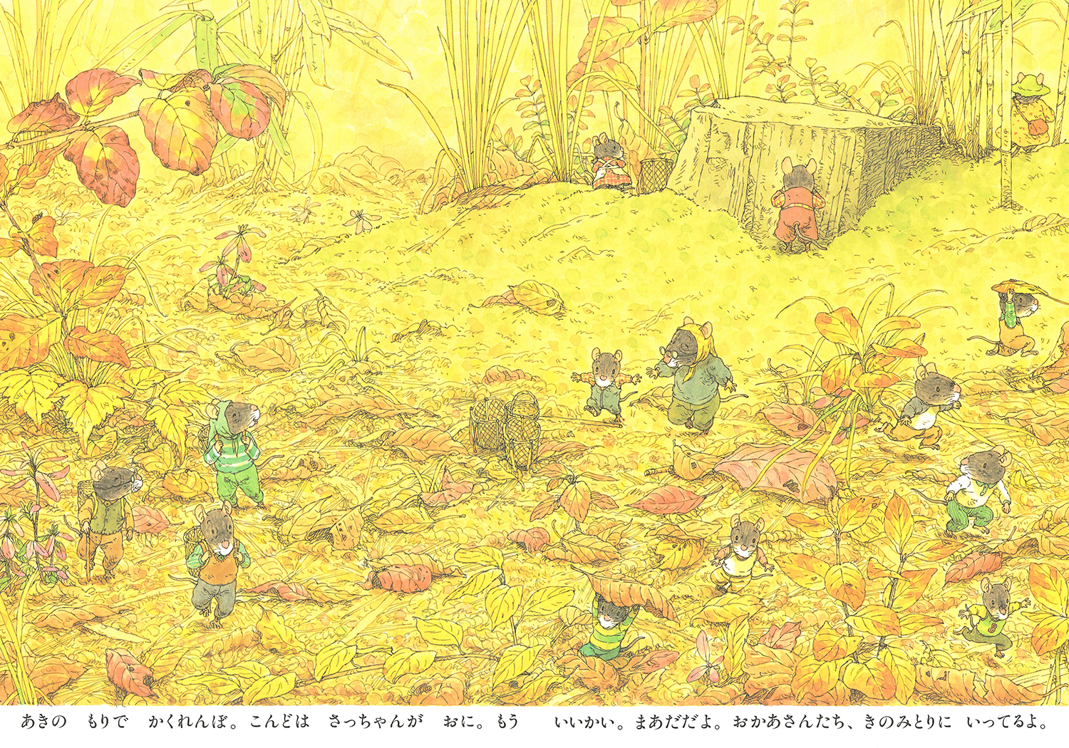 紅葉で色づいた秋の森。子どもたちは、お母さんたちが木の実採りに行った間に、おばあちゃんと一緒にかくれんぼです。さあみんなは、どこにかくれているのでしょう?「よっちゃんが みつかって、 あっ、いっくんも みーつけた。 にっくんと、ろっくん、はっくんは どこかな。」でも、あれれ、おっちょこちょいの、ろっくんだけがみつかりません。ろっくーん。ろっくーん。さがしているうちに、あきのやまのまつりにであったよ。せいやせいや、きのこのみこし。あきのまつりは、きのこのまつり。