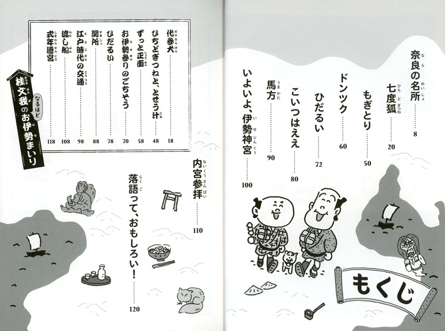 ある日、仲よしの喜六(きろく)と清八(せいはち)は、お伊勢参りの旅に出かけることになりました。この時代、お伊勢参りは、憧れの一大レジャー。行き帰りに8~10日かけての贅沢な旅で、着物や笠を新調して出かけます。途中、七度狐に化かされたり、見せ物小屋で騙されたり、役人につかまりそうになったりしながら、なんとかお伊勢さんに到着します。喜六と清八のやりとりが軽妙で、親しみやすく、上質の笑いに心休まる読後感です。