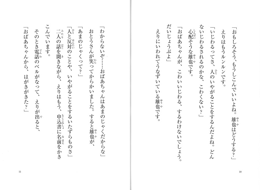3年前におじいちゃんが亡くなり、おばあちゃんはずっと沈み込んでいました。それを知る孫たちが、いじわるの中にある別のメッセージを感じとることで、この教室は成り立っているのだなあと思います。 孫の反応を想像してあれこれ準備するおばあちゃんは、きっと40ページの挿絵のような、ちょっぴり意地の悪い、でも楽しそうな笑みを、何度も浮かべていたのにちがいありません。すました顔でいじわるを言い、後に嬉しいことも用意しておく「あまのじゃく」な気持ちが、子どもたち側の物語から垣間見えます。