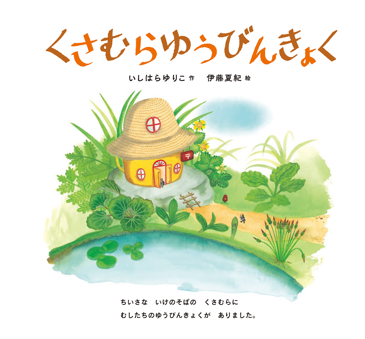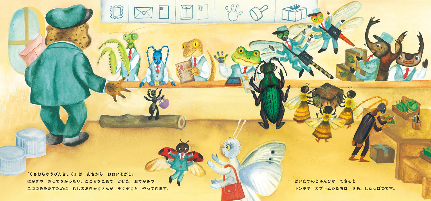 ちいさな池のそばの草むらに、虫たちの郵便局がありました。「くさむらゆうびんきょく」は、朝からおおいそがし。配達の準備ができると、トンボやカブトムシたちは、さぁ出発です。あじさいの葉のうえで、みんなの活躍をながめているのは、かたつむりの「でんでん」です。「ぼくも やくにたつ しごとが してみたいな」でんでんはゆうびんきょくに行ってみることにしました。