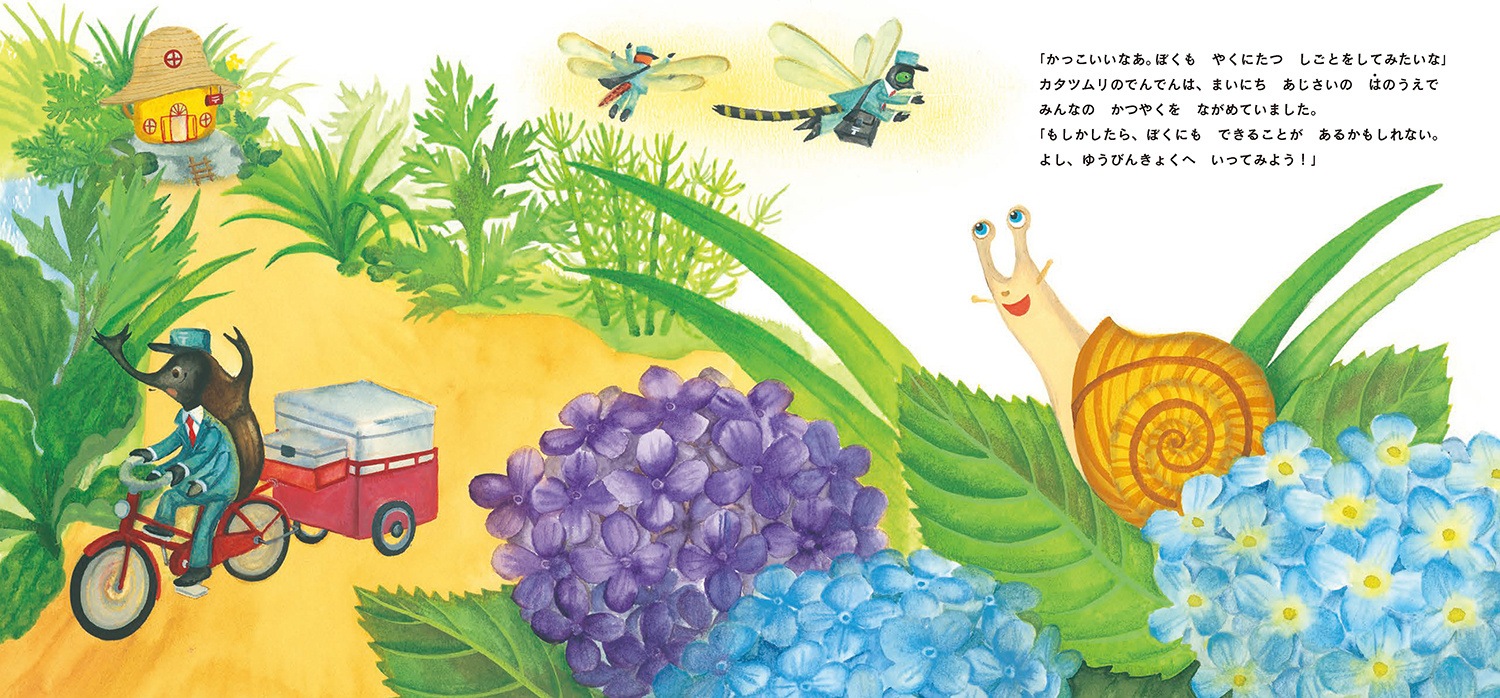 ここは、だれでもとくいなことで活躍できる「くさむらゆうびんきょく」。かたつむりのでんでんの物語がはじまります。