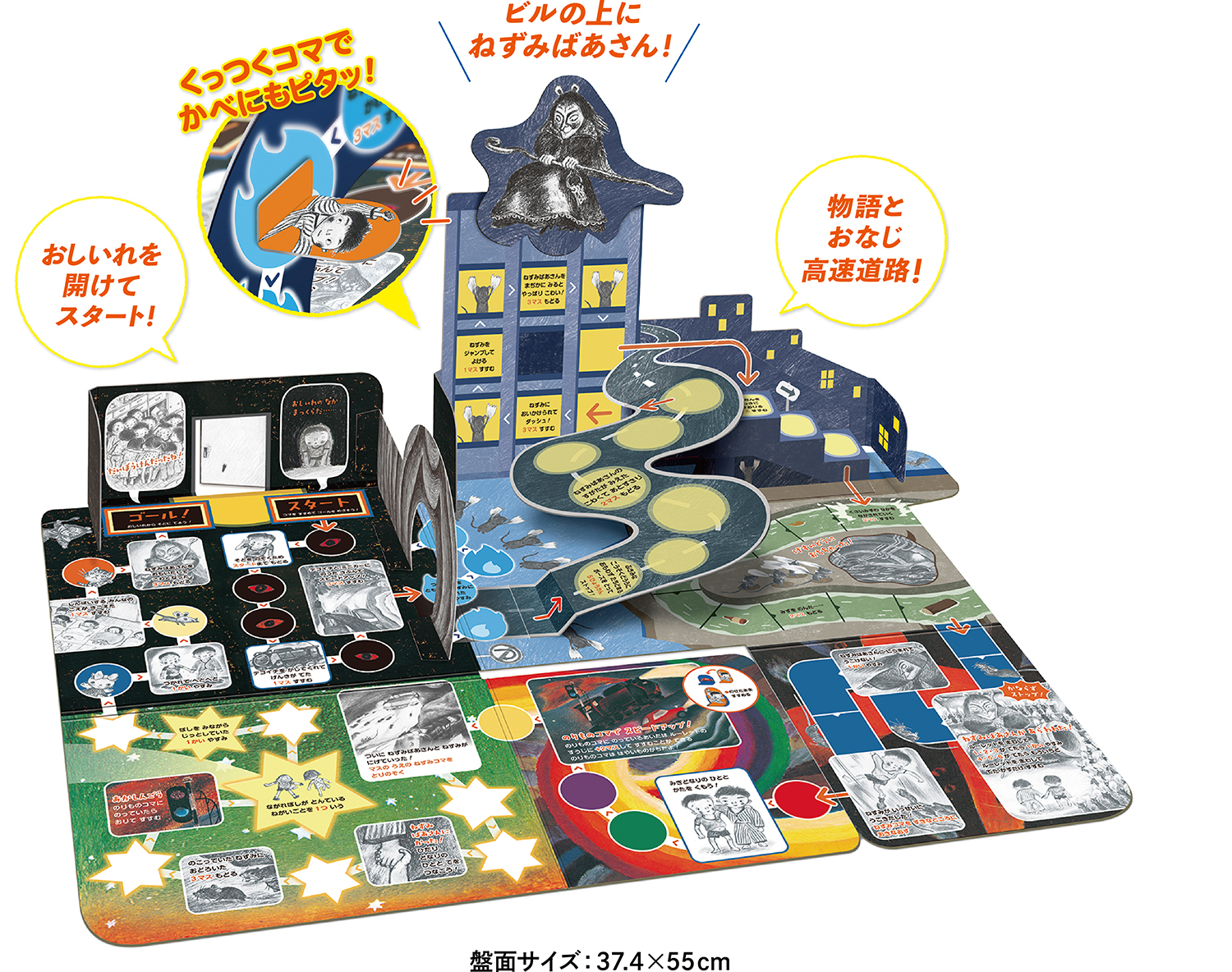 ひらいてびっくり! ビルや高速道路が飛び出す、立体すごろくです。くっつくコマで、絵本の世界を大ぼうけん。壁をのぼったり、高速道路を進んだり。まるで絵本の中に入ったような臨場感たっぷりのすごろくです。