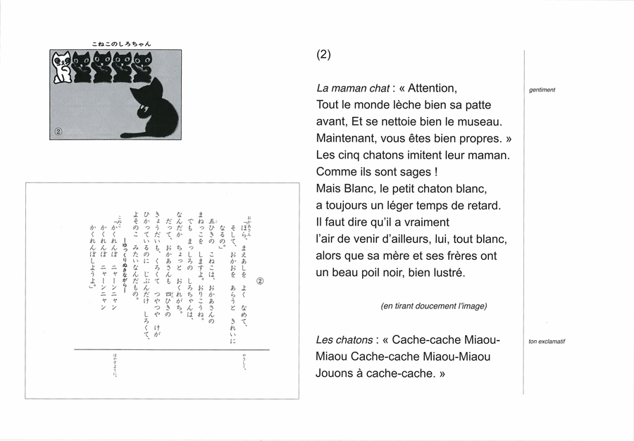 しろちゃんの行動に、観客もハラハラドキドキ。最後には立派な白猫のおとうさんに出会って、自分がなぜ白いのかわかったしろちゃん。自分が自分であることが誇らしく、うれしいしろちゃんの気持ちが、紙芝居をみる子ども達にも伝わってきます。人気のロングセラー紙芝居のフランス語版。日本語の脚本も併記しています。