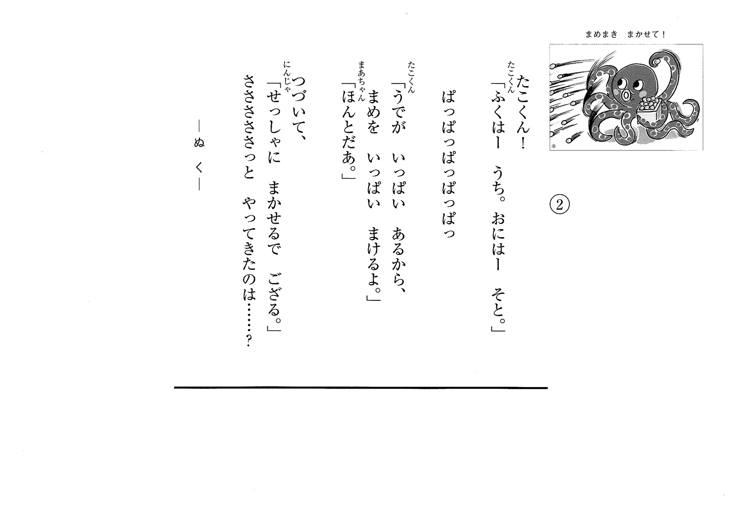今日はせつぶん、豆まきです。豆をまいて福をよび、鬼をおいだす日です。「がおー、おにだぞう」ところがまあちゃんは、鬼がこわくて豆がまけません。するとそこへ、たこがくにゃくにゃくにゃと、やってきて……。