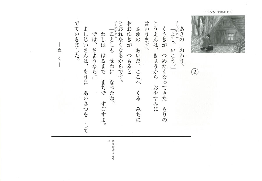 もうすぐ冬。こころもりの公園は春までおやすみ。よしじいさんは町へおります。大みそか、よしじいさんはマフラーをわすれたことを思い出して森の小屋にもどると、けしたはずの明かりがついています。見ると、小屋の中で森の動物たちがなにかやっているのです…。