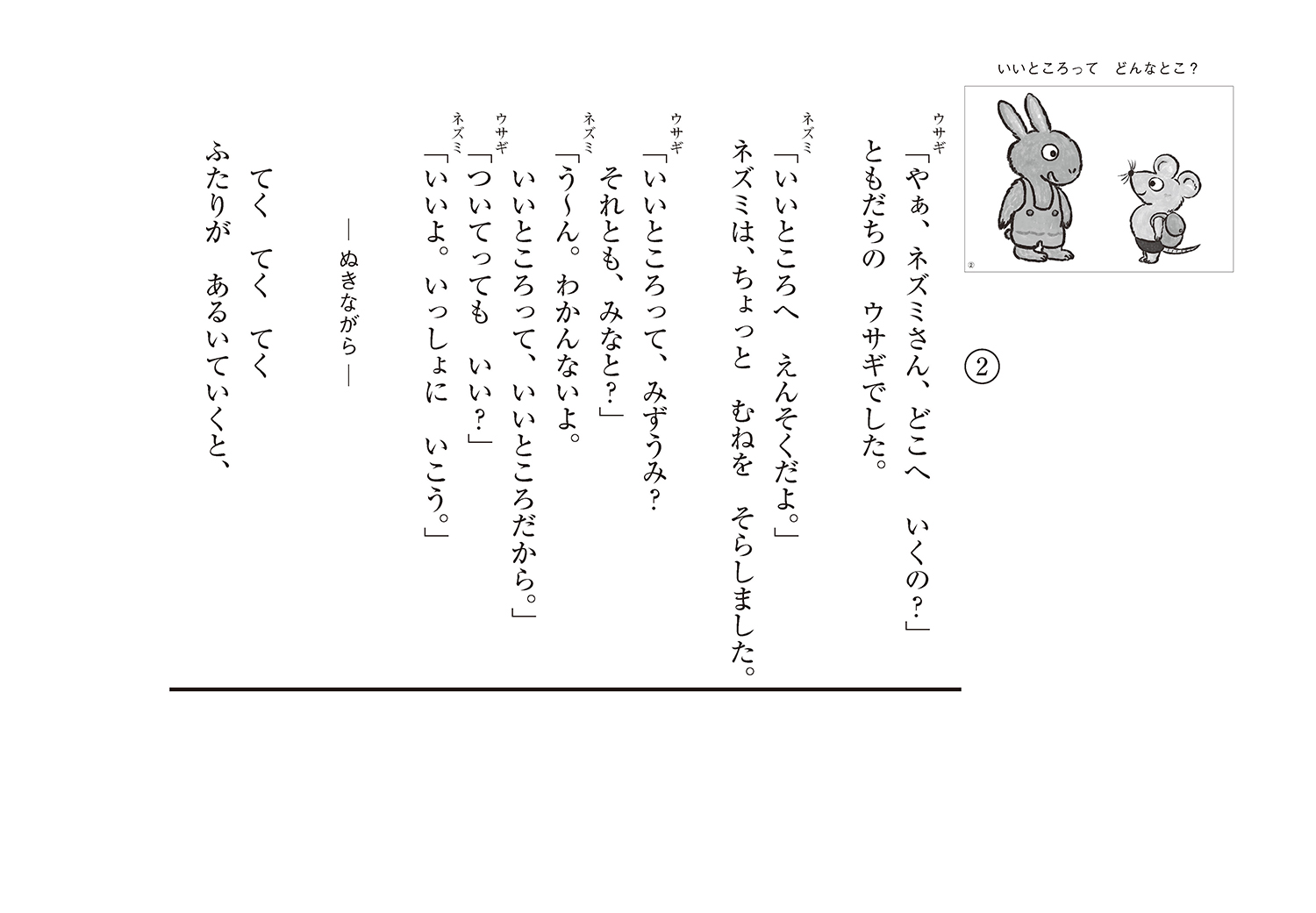 「いいところにいきたいな」ネズミは、ひとりで遠足にでかけました。ウサギとヤギにであい、一緒に"いいところ"にむかいます。そこにオオカミがあらわれて、「おれもついていく!」といいだします。オオカミとともに"はげやまのてっぺん"にむかうことになり……。