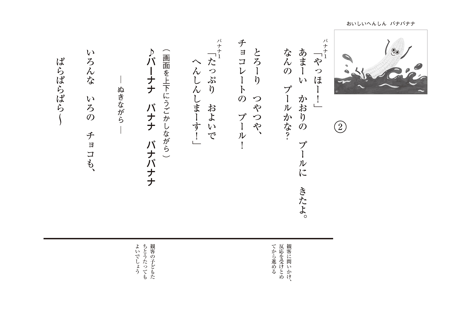 おいしくそだったバナナたち。「ぼくたちこれからへんしんするよ!」いちばんはじめのバナナさんは、どぼーん! とびこんだところは、あまーいかおりの、チョコレートのプール! 何になるかはおたのしみ!♪バーナナバナナ バナバナナ 楽しいリズムで大変身。ゆかいでおいしい紙芝居。